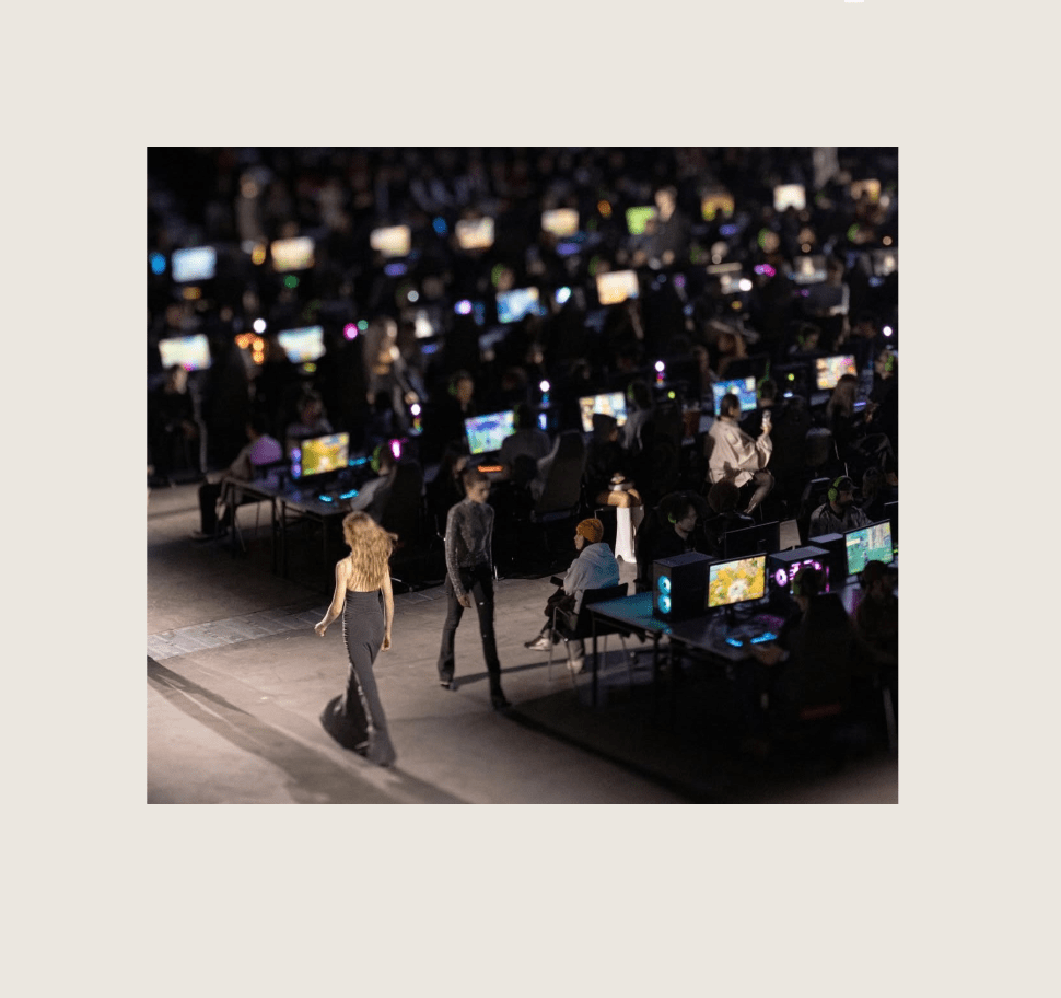 As many of you probably know, Coperni turned their Fall-Winter show this Paris fashion week into a LAN (local area network) party, a gathering where gamers come together to play multiplayer video games on their computers. This was a more popularized idea during the 90s and the early 2000s. Evidently, Coperni’s LAN party wasn’t conventional since, of course, it was also a fashion show—but it was also unique in its immensity of scale. The computer setup tables spanned up and down across the Paris Adidas Arena, which has a capacity of about 9,000 people.