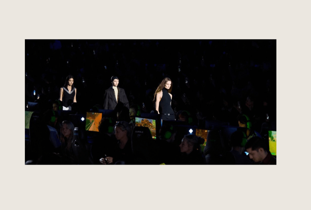 The runway was constructed so that the models would walk up and down the aisles created by the tables. The tables, long and narrow but dense with tech setups on each side, continuously had gamers facing their screens in every other seat, with show attendees sitting between them. As the models made their way down the runway, attendees admired, but the gamers didn’t turn around or even look up from their screens. The arena, so dark that it was almost blue or violet, painted midnight, and even the clothes, sultry, tailored, and fresh, felt somewhat swallowed by the beaming and ongoing action compiled screens. While the runway was graced by interesting cuts, playful material, and even many references to their own digital culture, the gamers were still in their zone. As someone who drinks good fashion like it’s water, this feels like a criminal act. And I’m sure many of you reading this might feel the same. But often now, the stimulation that tech is offering is so immense that it’s steering us away from stimulating our minds with art. Even the art that is meant for us—that appeals to what we already love (the gamers in the show missed out on seeing manifold looks inspired by games like Sailor Moon, Tomb Raider, etc.).