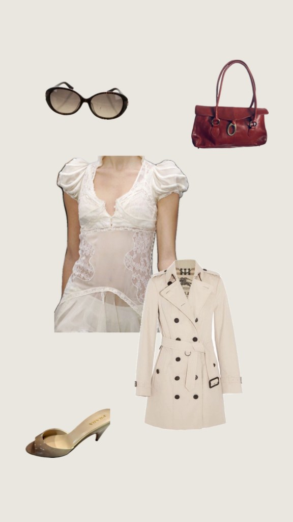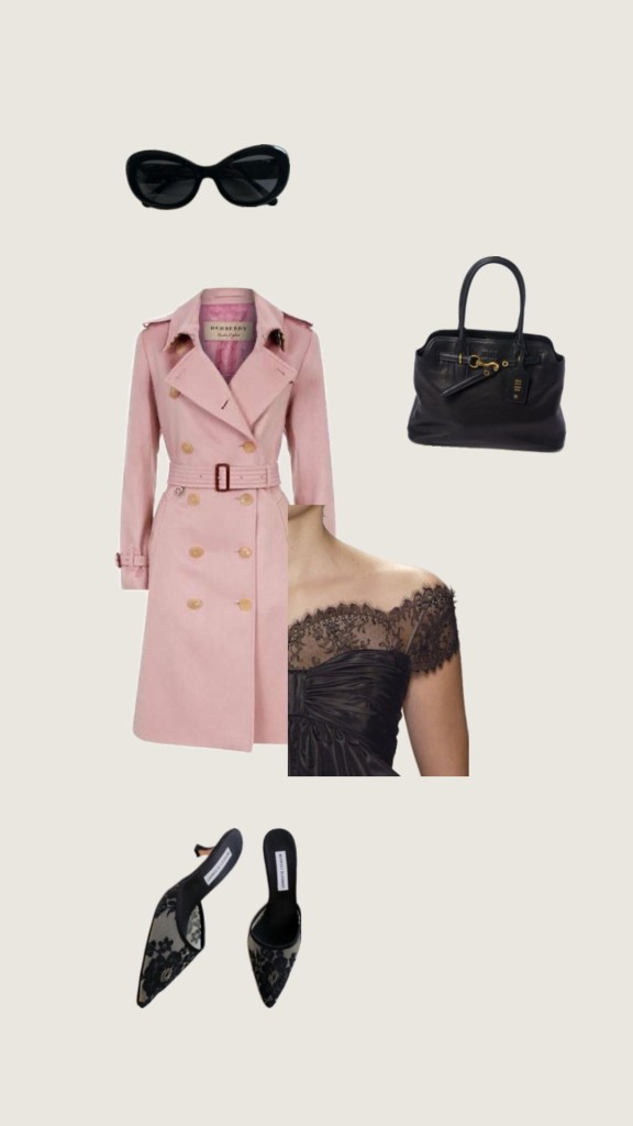 Women’s Pink Cashmere Trench Coat (Similar: Theory Double-Breasted Overcoat in Double-Face Wool-Cashmere), Dress: Oscar de la renta spring 2007 (Similar: Oscar de la Renta Square Neckline Mini Dress), Shoes: Manolo Blahnik Lace Pattern Mesh Accents Mules.