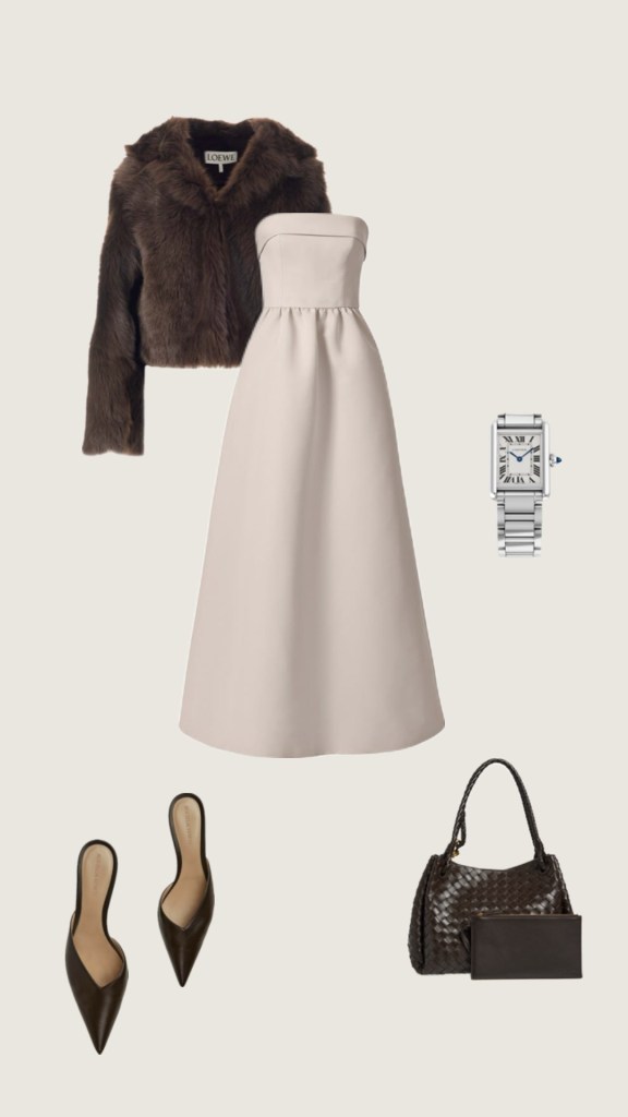 Jacket: Loewe shearling hooded jacket, Dress: Amsale Rene, Watch: Tank Must de Cartier watch, Shoes: Bottega Veneta (Similar: Gal Pointed Toe Kitten Heel Mule, Bag: Dark Brown Bottega Veneta Parachute large intrecciato leather shoulder bag.