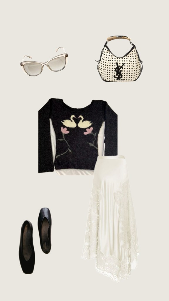 Sunglasses: Versace Cat-Eye Tinted, Sweater: Knit Swan Longsleeve Top, Skirt: Ulla Johnson Cressida Floral Tulle Panel Silk Maxi Skirt, Shoes: The Row Eva Two Leather Ballet Flats, Bag: Yves Saint Laurent Rare Polkadot Mombasa Bag (Similar: Yves Saint Lauren Rive Gauche canvas with leather detailing tote.
