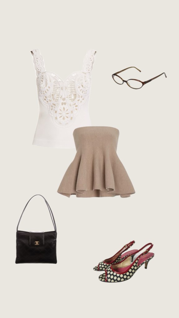 Top: Elie Saab fall 2024 embellished lace top (Similar: Ulla Johnson Jael cropped cotton and silk-blend lace tank), “Skirt”: Brandon Maxwell Daria Wool-blend Peplum Top In Brown (Yes, we are styling a top as a skirt. You could say it’s lazy of us or you could say its Margiela of us, we think the latter obviously), Bag: Chanel Quilted CC Shoulder Bag, Shoes: Kate Spade Italy Black White Silk Leather Polka Dot Peeptoe Slingbacks, Glasses: Vera Wang.