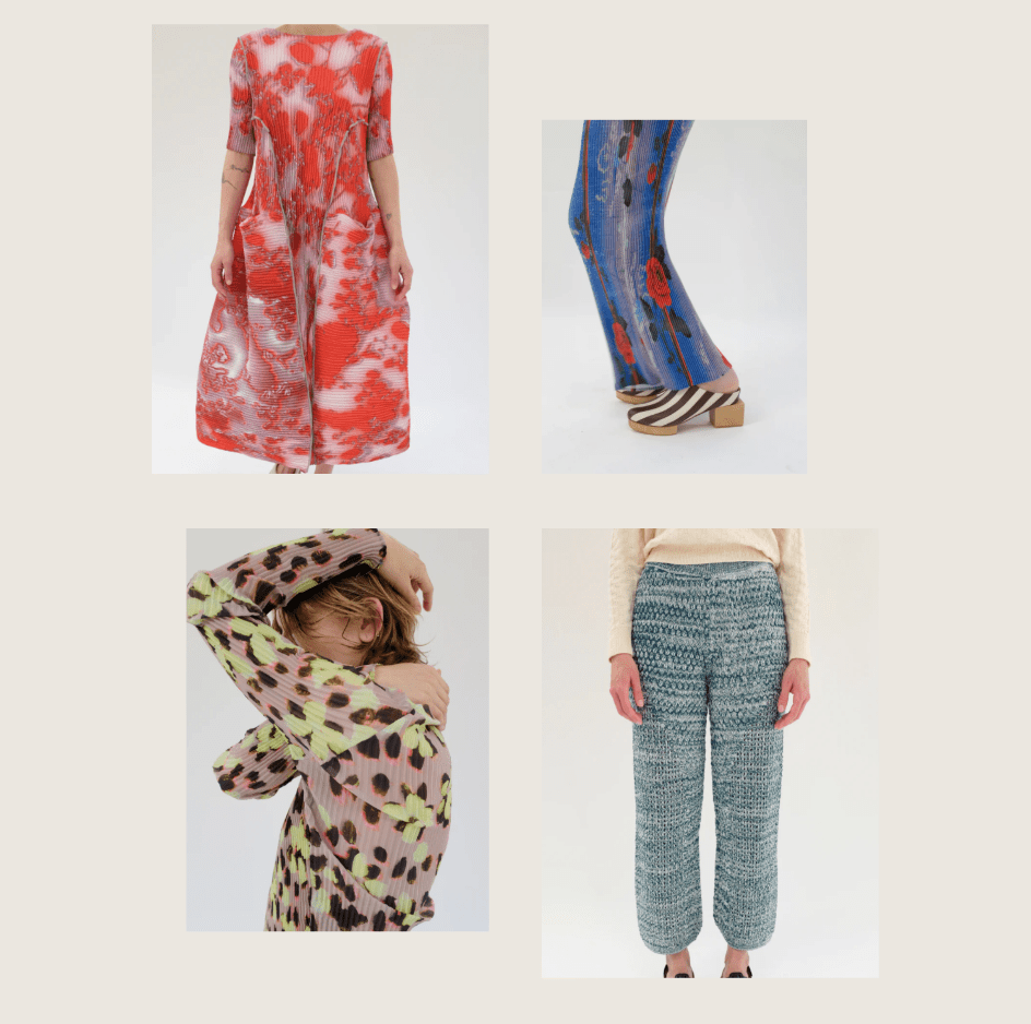 “Beklina was founded by Angelina Rennell in 2006 for the candid, evolving, and artistic woman. For over 18 years Beklina has created and curated a tight edit of beautiful and thoughtful fashion, objects, and content. We hope to connect unique perspectives that attracts those of similar passions. More than a shop, Beklina also produces an ongoing collection, from knits, swimsuits, pants, pillows, rugs, art, jewelry, housewares, textiles, to random objects and handmade clogs. The Beklina collection is produced ethically in the USA & Peru.” What’s most interesting are the patterns and pleated fabrics… uniquely stylish.