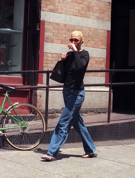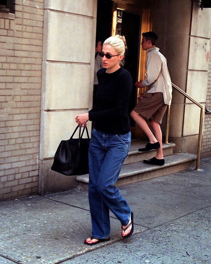 Shoes. In everyday life, Carolyn preferred classic flat loafers, sandals, heeled pumps, and mules. But we can’t forget about her knee-high boots, usually in black or brown, which once again reflected the main colour palette in Carolyn Bessette-Kennedy’s clothing. Her choice of flip-flops might seem quite unexpected, but considering we are not talking about sports ones and rather her black leather ones, they were actually on theme. Today, Carolyn might have appreciated the rubber tongs from The Row. She rarely appeared in public in trainers, but when the occasion arose, her choice fell on Adidas.