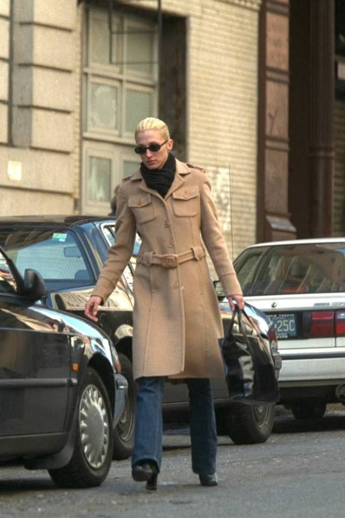 Statement outerwear. In keeping with the overall calm and neutral colour palette of her outfits, Carolyn Bessette Kennedy’s outerwear was mainly black and camel. However, she allowed herself to experiment with fabrics, prints and sometimes even colour. We can recall the ruffled Yohji Yamamoto coat she wore to the ‘Newman’s Own’ George Awards, or the red plaid Prada she wore out and about in New York City.