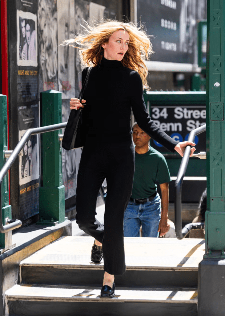 Carolyn paid a lot of attention to bags. She was most often seen with the Prada Spazzolato Tote, which the brand reissued in 2022 under the name Carolyn, or the Hermes Birkin 40. On vacation or when traveling, she took the L.L. Bean Boat and Tote with her. Simple and concise designs, spacious volume, but no shapelessness. The tote bag that Sarah Pigeon appeared with in one of the shots from the shoot or the Birkin 35 bag are very different from what fans of the Carolyn Bessette-Kennedy style are used to. The same unsatisfactory comments can be found regarding the choice of outerwear. The camel coat that Pidgeon appeared in caused outrage due to its cheap material and fit, which is far from the perfectly tailored Carolyn’s coat from Prada.